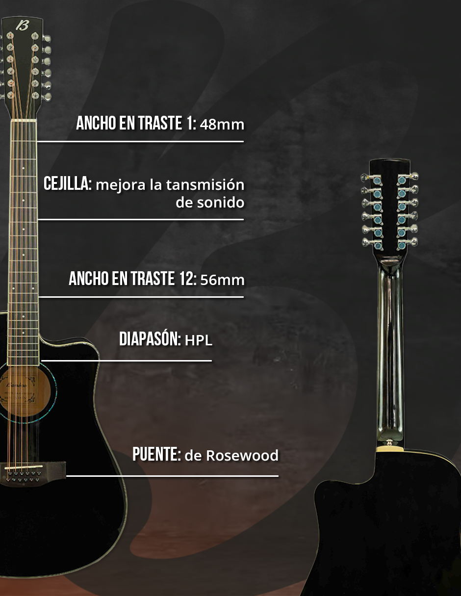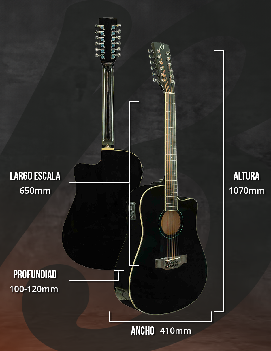 • Guitarra electroacústica de 12 cuerdas (Docerola) tamaño 42", ideal para música norteña, corridos y estilos que requieren un sonido con cuerpo y armónicos.