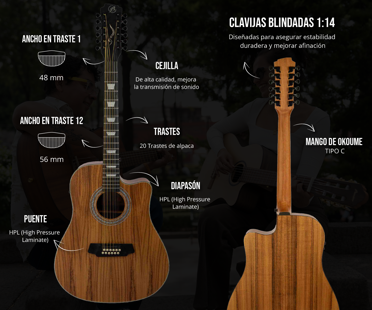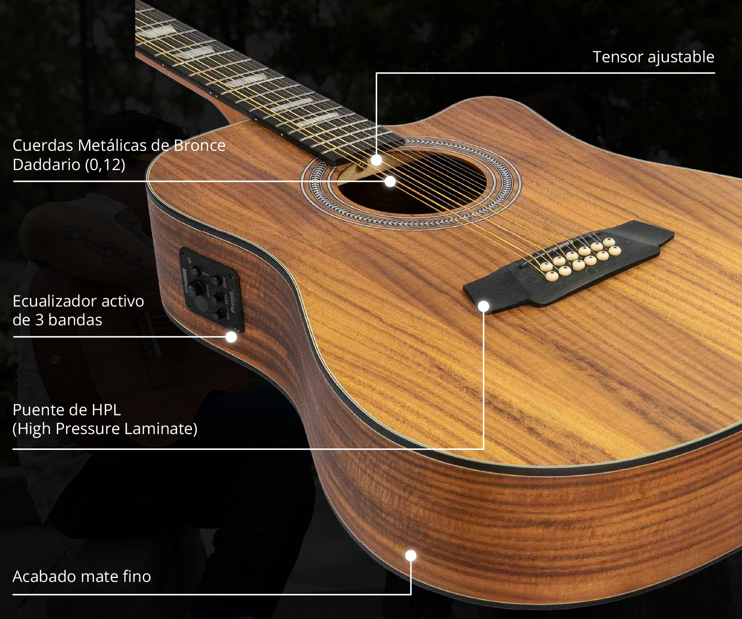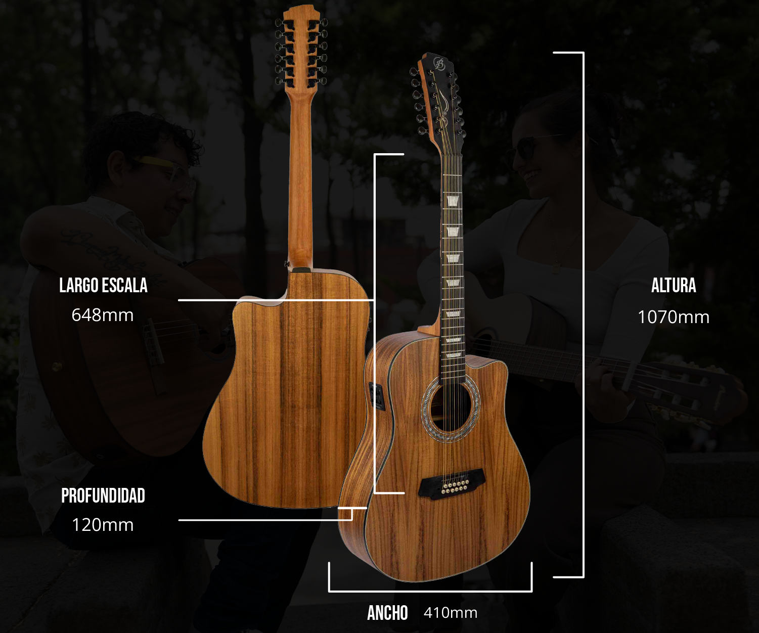 • Guitarra electroacústica de 12 cuerdas (Docerola) tamaño 42", ideal para música norteña, corridos y estilos que requieren un sonido con cuerpo y armónicos.