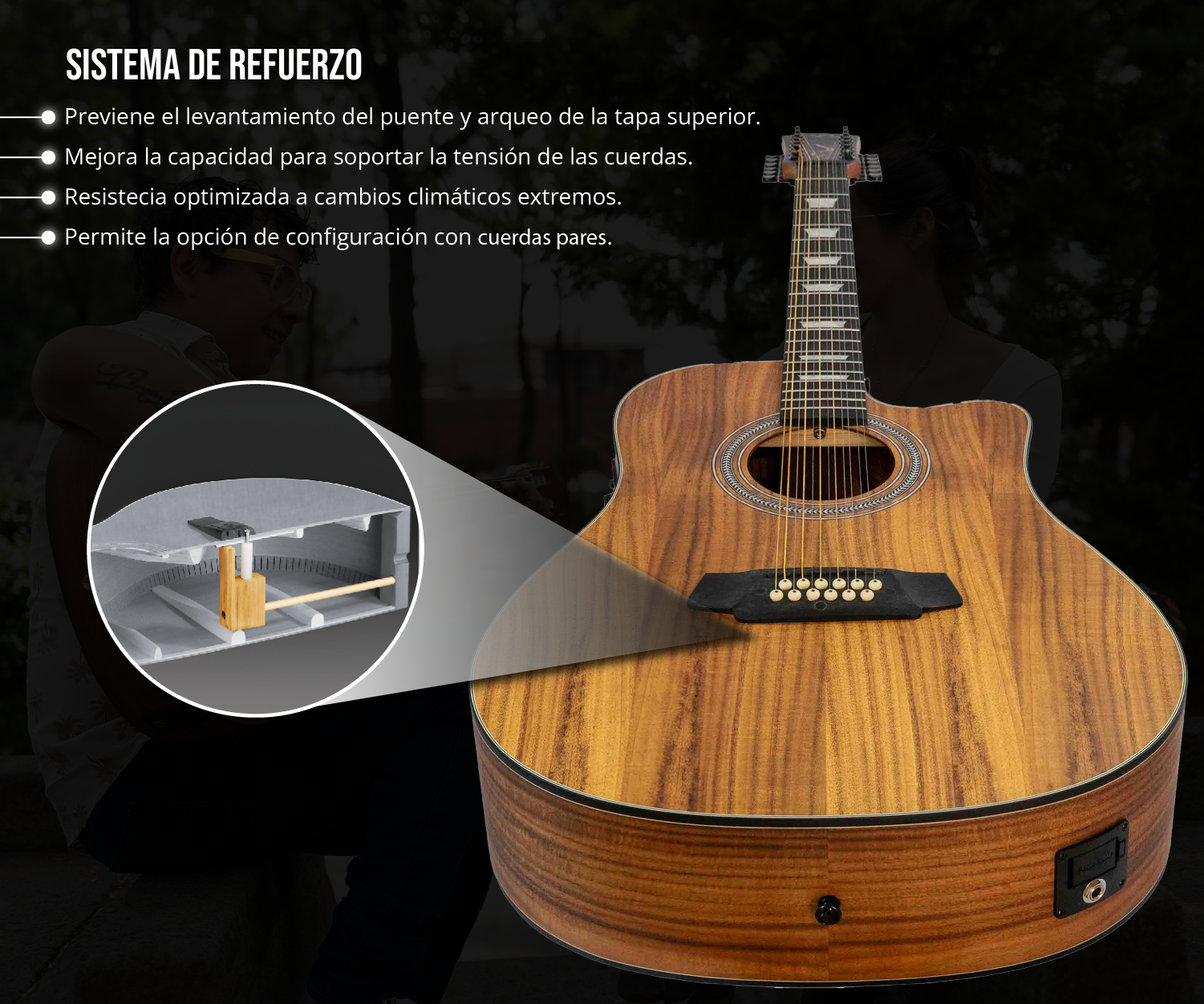 La guitarra electroacústica Docerola PRO de 12 cuerdas es nuestro modelo TOP de Docerolas, diseñada especialmente para los amantes de la música norteña. Con su cuerpo de madera de Koa, esta guitarra ofrece una combinación única de belleza estética y sonido cálido y resonante.