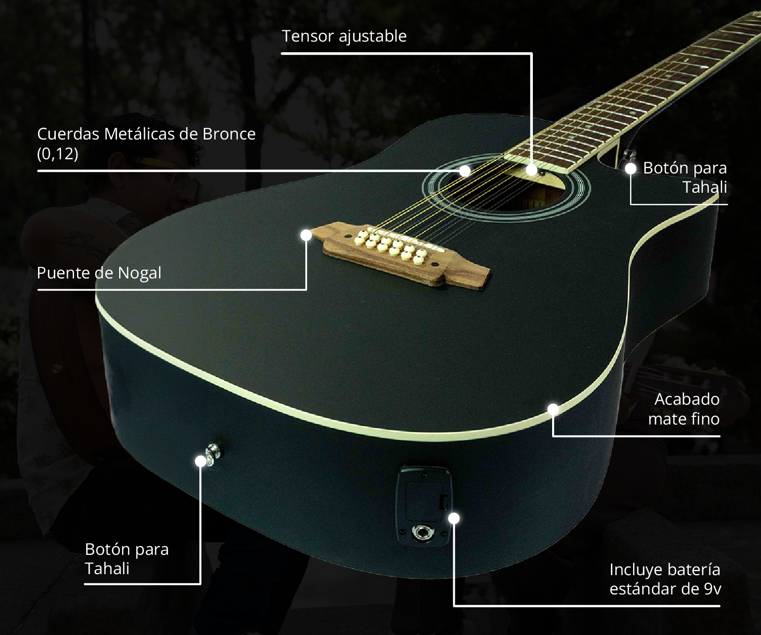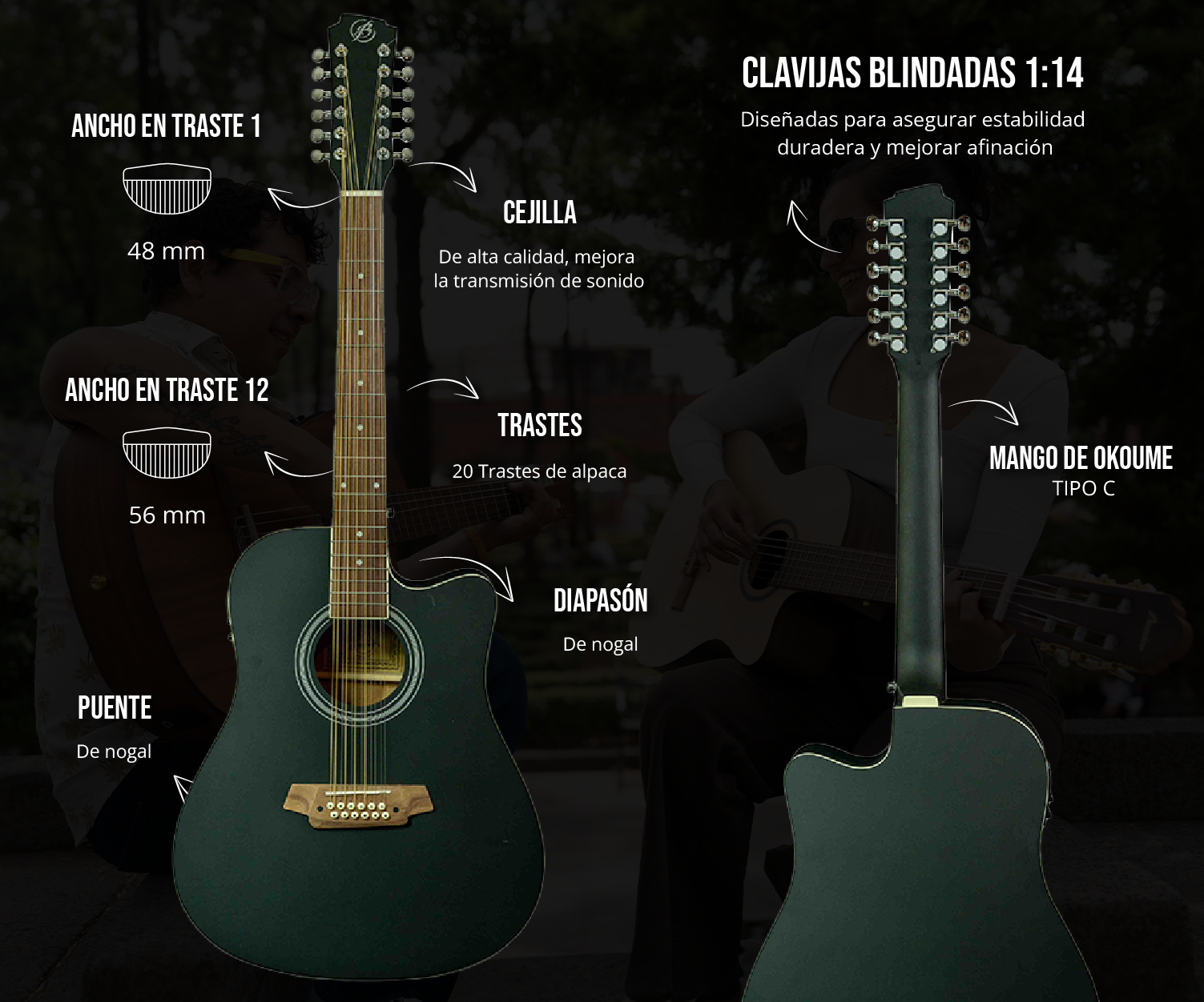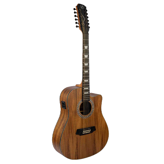 • Guitarra electroacústica de 12 cuerdas (Docerola) tamaño 42', ideal para música norteña, corridos y estilos que requieren un sonido con cuerpo y armónicos.