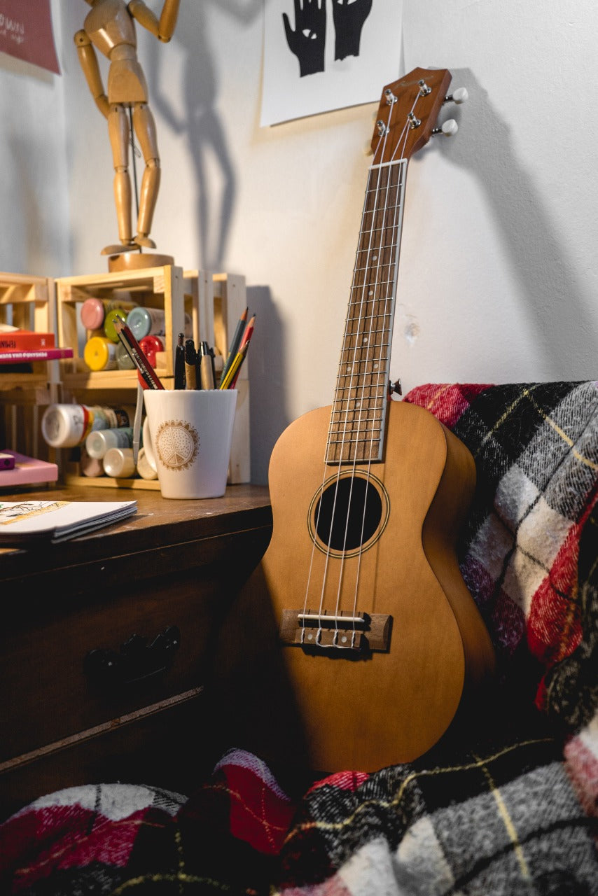 El ukelele concierto es un poco más grande (23” pulgadas) que el ukelele soprano (21” pulgadas). Lo que le da nuevas características: el cuerpo del instrumento es más grande, por lo que ganamos resonancia (volumen) logrando conseguir un tono más cálido y grave sin perder el sonido clásico del ukelele. Además, con un mástil más largo tenemos más espacio entre los trastes y resulta mucho más cómodo de tocar para las personas que tienen un tamaño de mano más grande. Este instrumento es de gran calidad y con excelentes terminaciones, de fácil traslado por su tamaño.