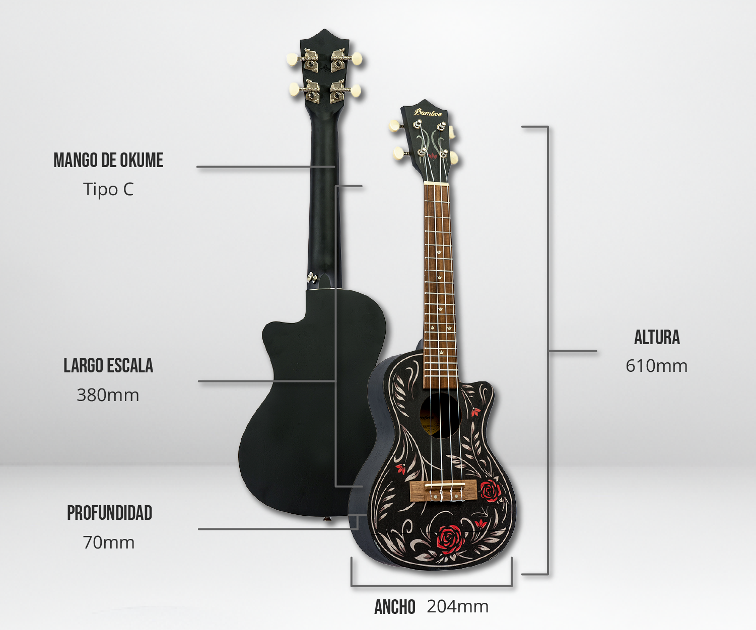 El Ukelele Concierto Roses & Roll es la elección perfecta para músicos que buscan un equilibrio entre elegancia y actitud. Su diseño full black con detalles florales y acabado de alta calidad lo convierten en un instrumento único, ideal para quienes desean destacarse tanto en el escenario como en cualquier otro entorno.