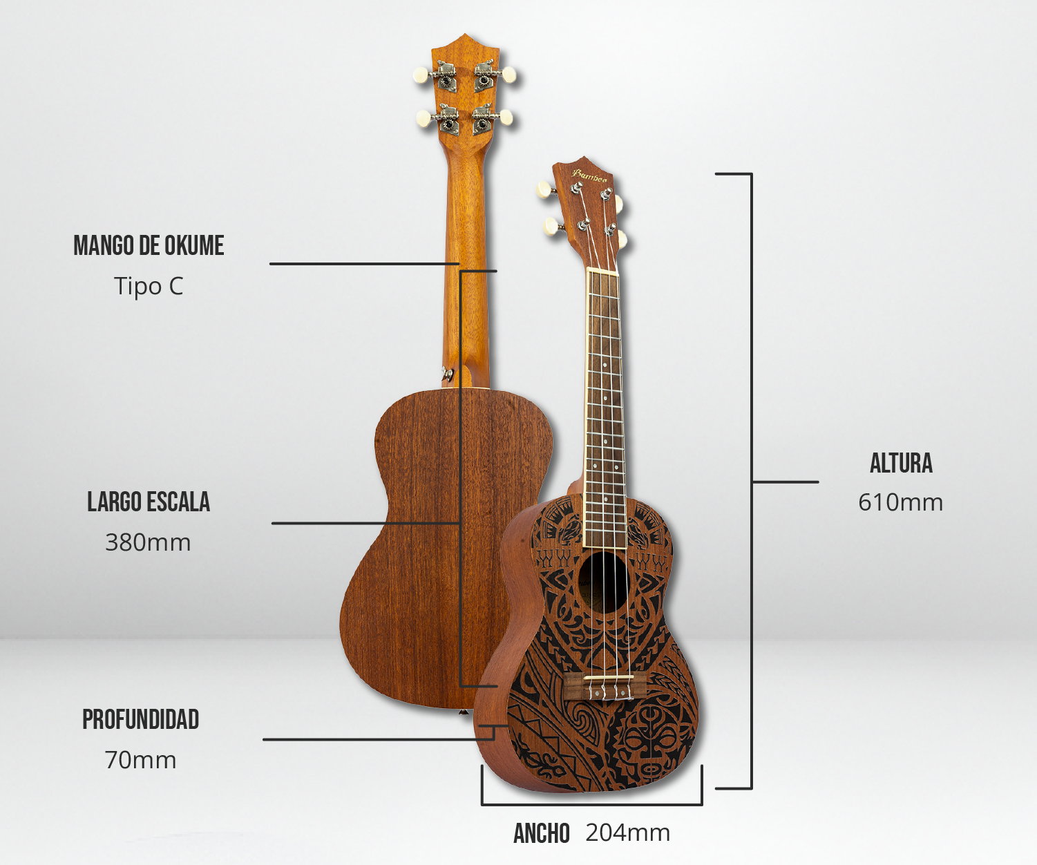 El ukelele concierto es un poco más grande (23” pulgadas) que el ukelele soprano (21” pulgadas). Lo que le da nuevas características: el cuerpo del instrumento es más grande, por lo que ganamos resonancia (volumen) logrando conseguir un tono más cálido y grave sin perder el sonido clásico del ukelele. Además, con un mástil más largo tenemos más espacio entre los trastes y resulta mucho más cómodo de tocar para las personas que tienen un tamaño de mano más grande. Este instrumento es de gran calidad y con excelentes terminaciones, de fácil traslado por su tamaño.