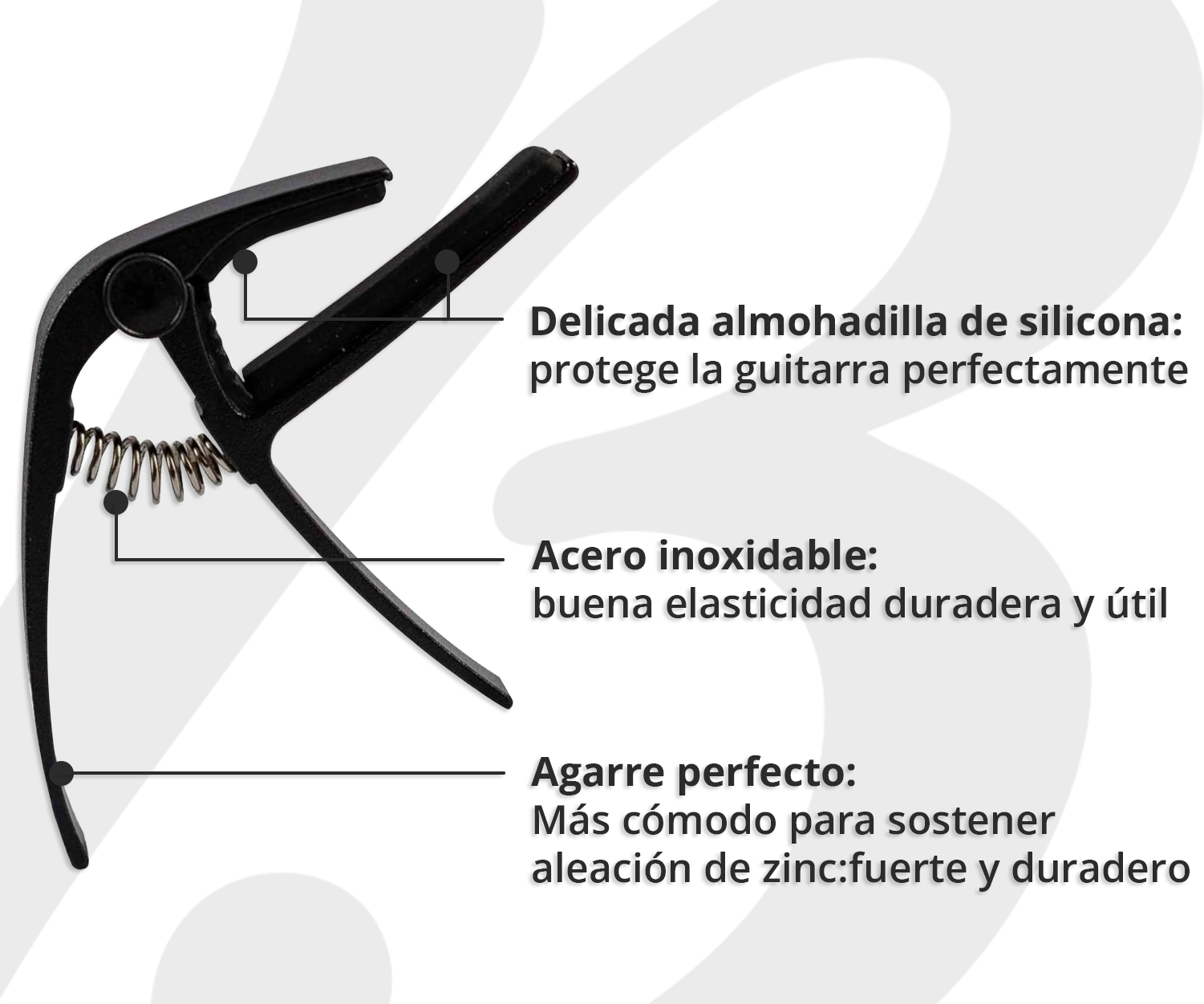 Hecho de aleación de aluminio con almohadillas de tactopiel que protegen los acabados de tus instrumentos. Este capo cuenta con una amplia mordaza de muelle ajustable que ofrece una firme sujeción, evitando la pérdida de presión en las cuerdas y ayudando a mantener un sonido nítido y claro.