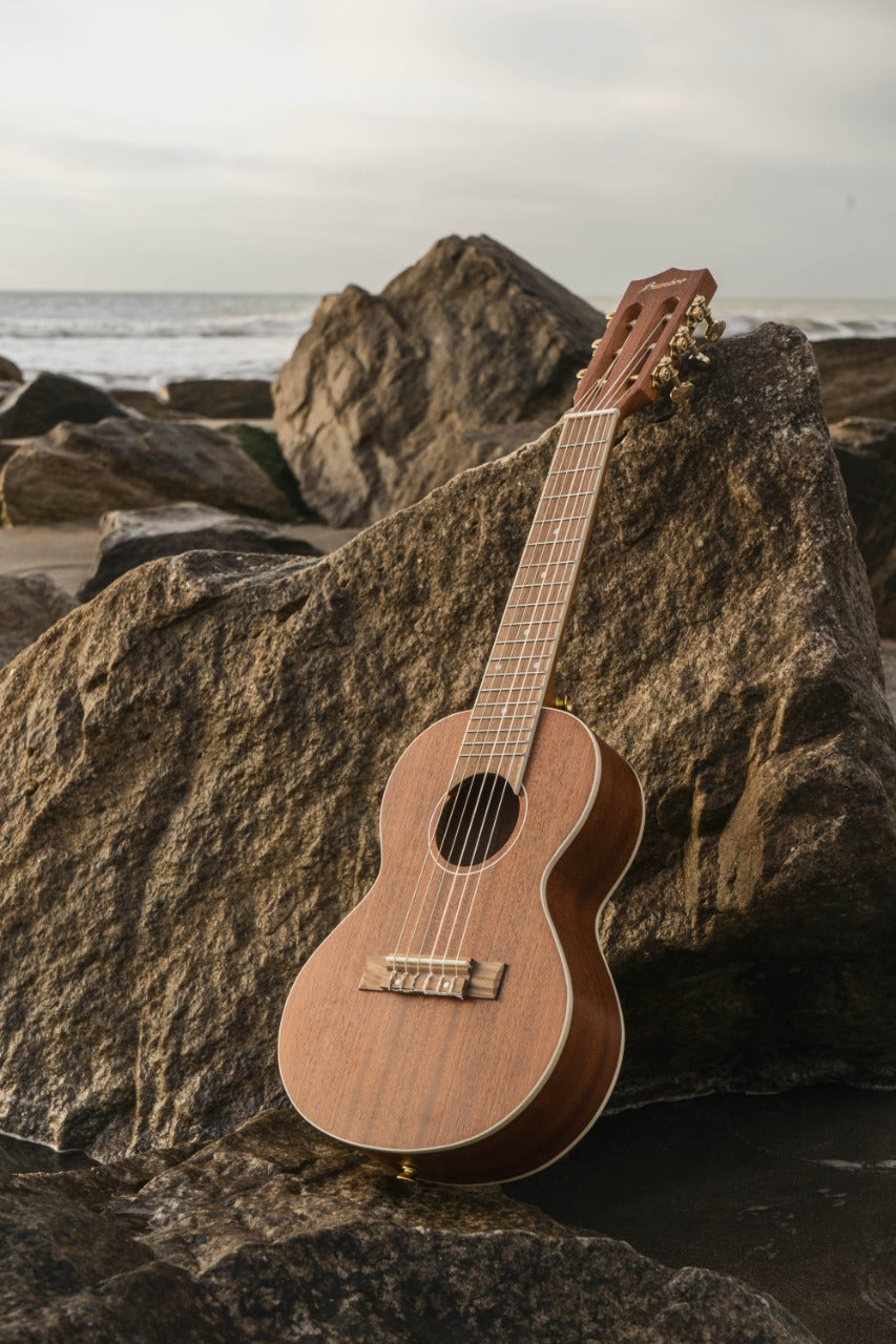 El Guitarlele es una fusión entre una guitarra clásica/criolla y un ukelele, conservando el cuerpo y tamaño del ukelele sumándole las 6 cuerdas de la guitarra. Este instrumento se afina en LA RE SOL DO MI LA (Afinación standard de una guitarra clásica con cejilla en el 5to traste).