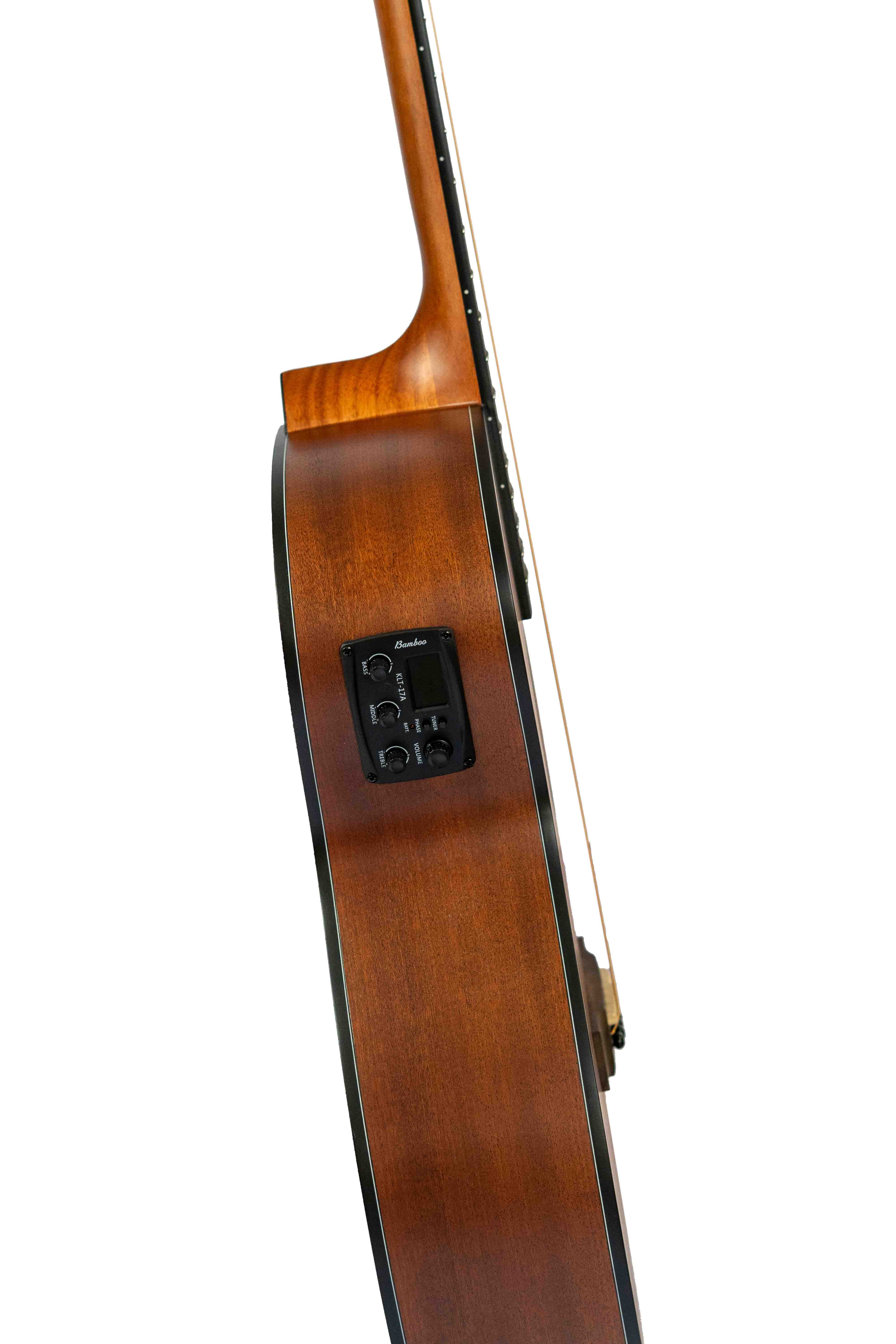La terminación mate resalta la textura natural de la madera, sumando una estética sobria y elegante. Equipada con electrónica Bamboo de 3 bandas con afinador incorporado, brinda control y precisión en todo tipo de presentaciones.