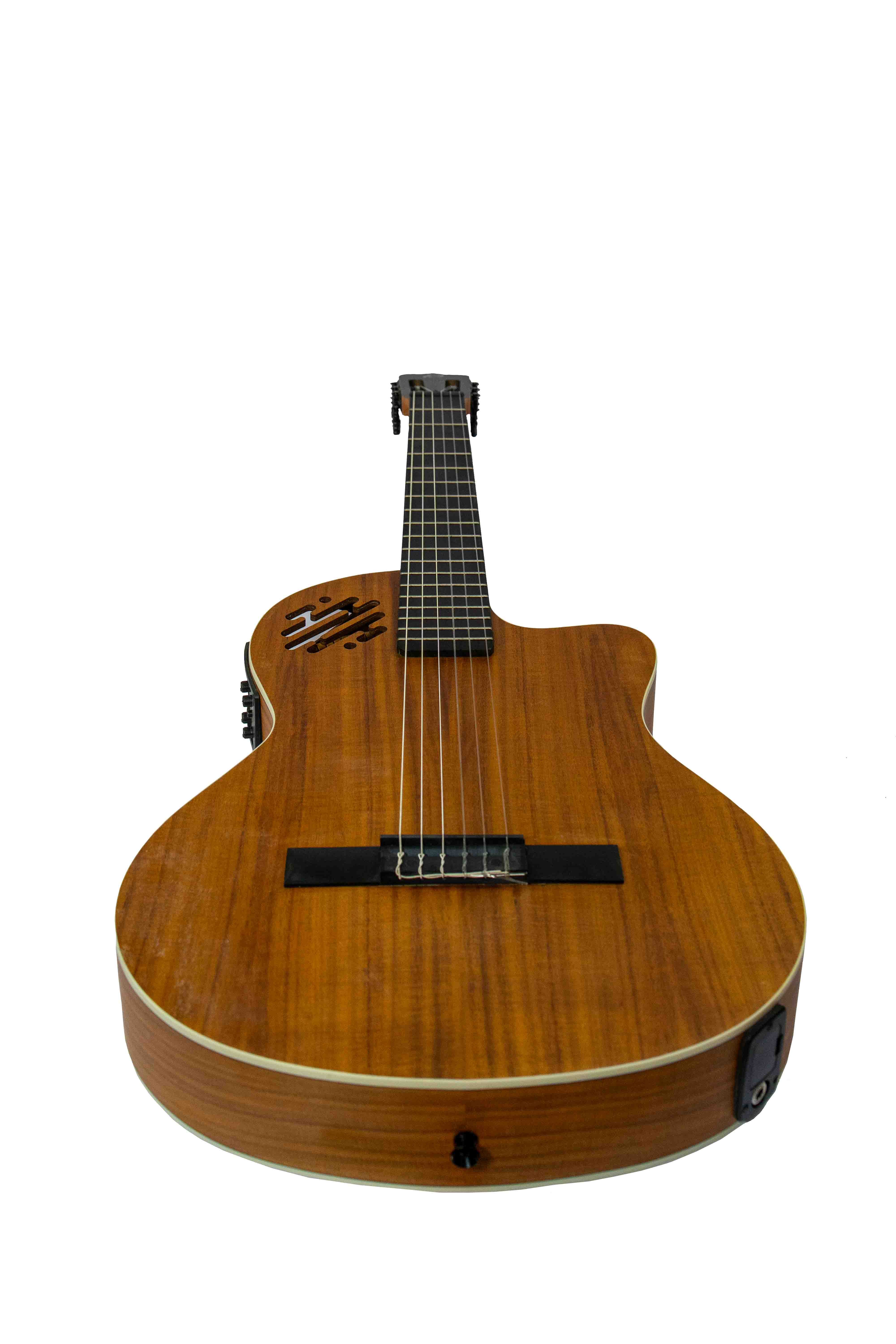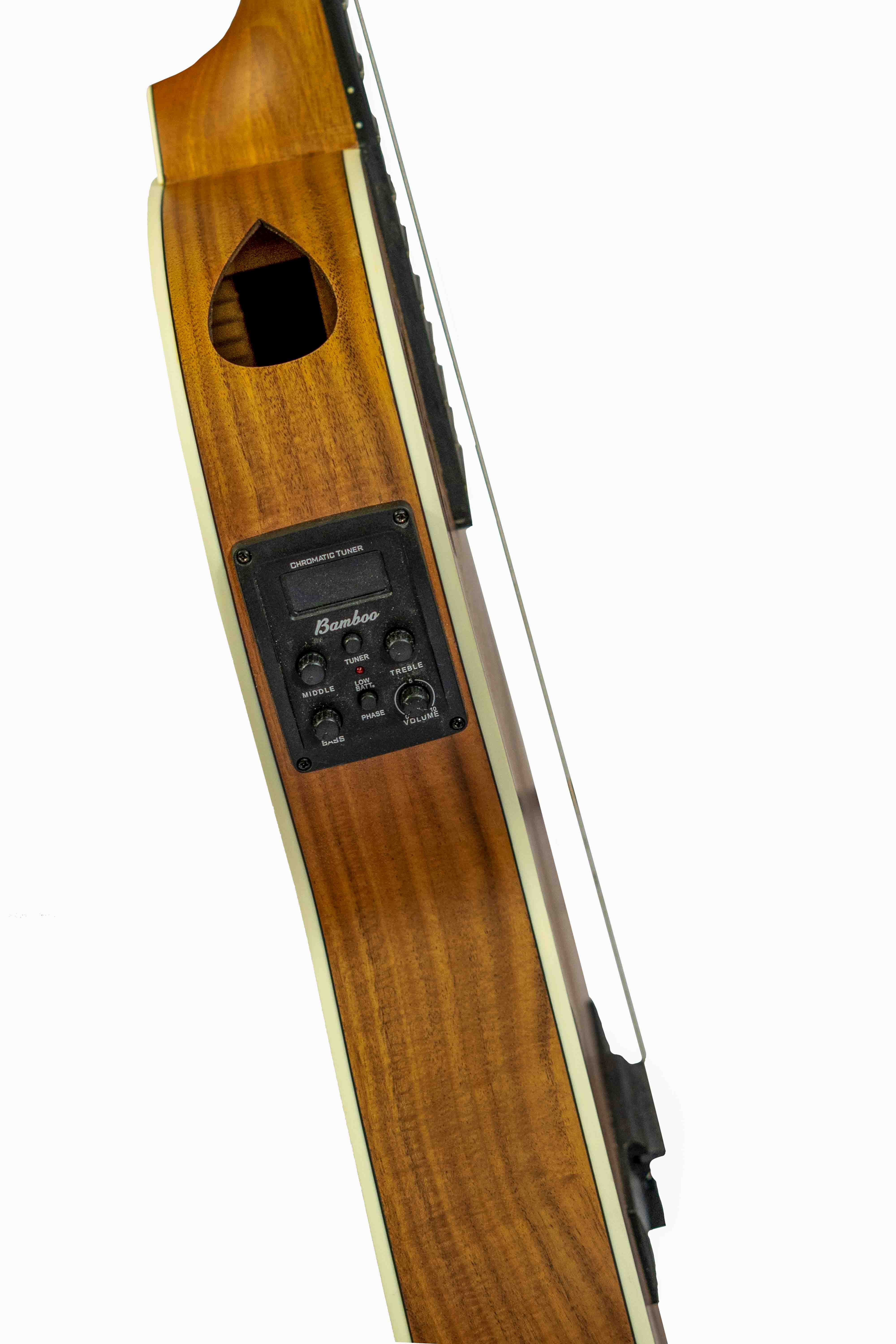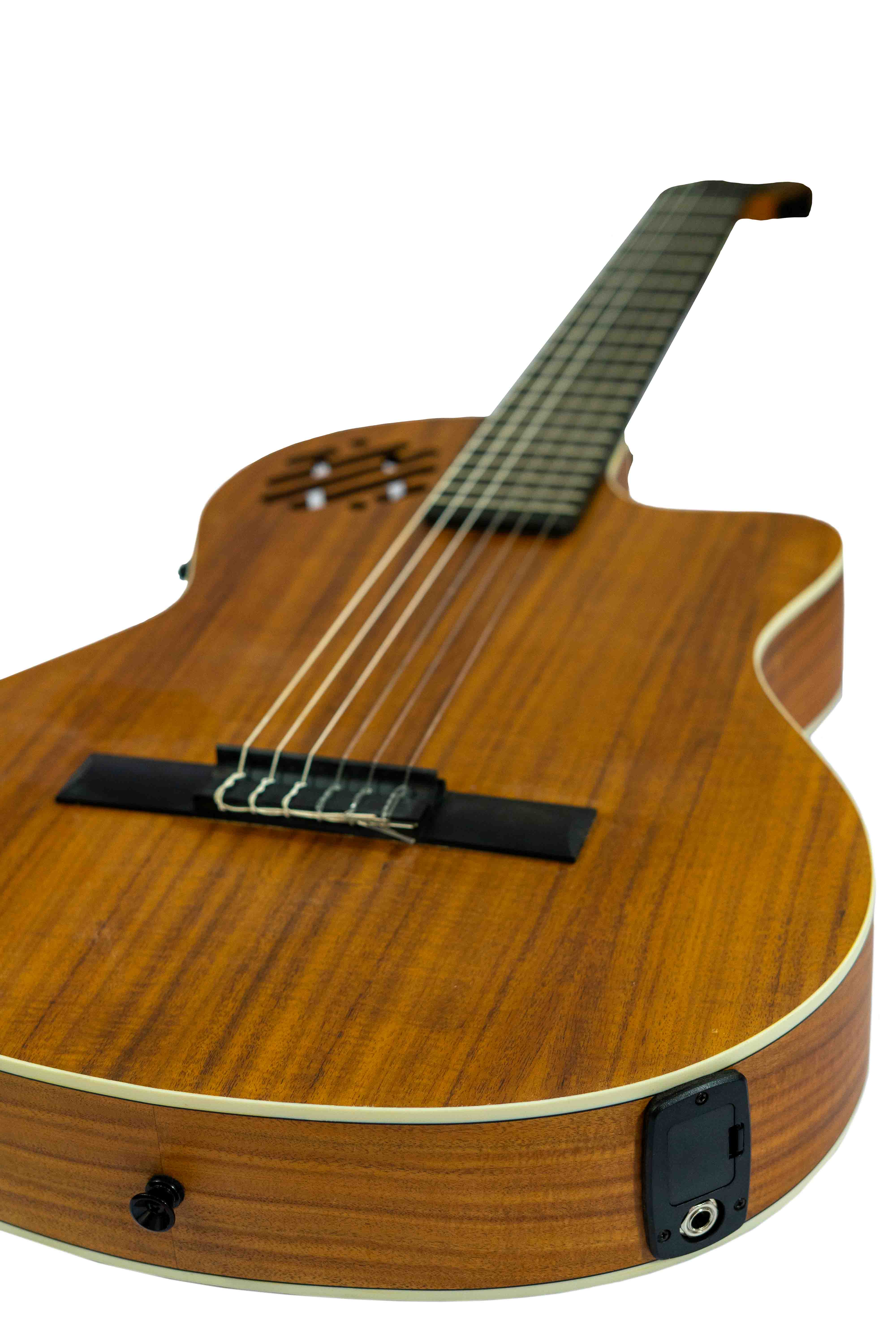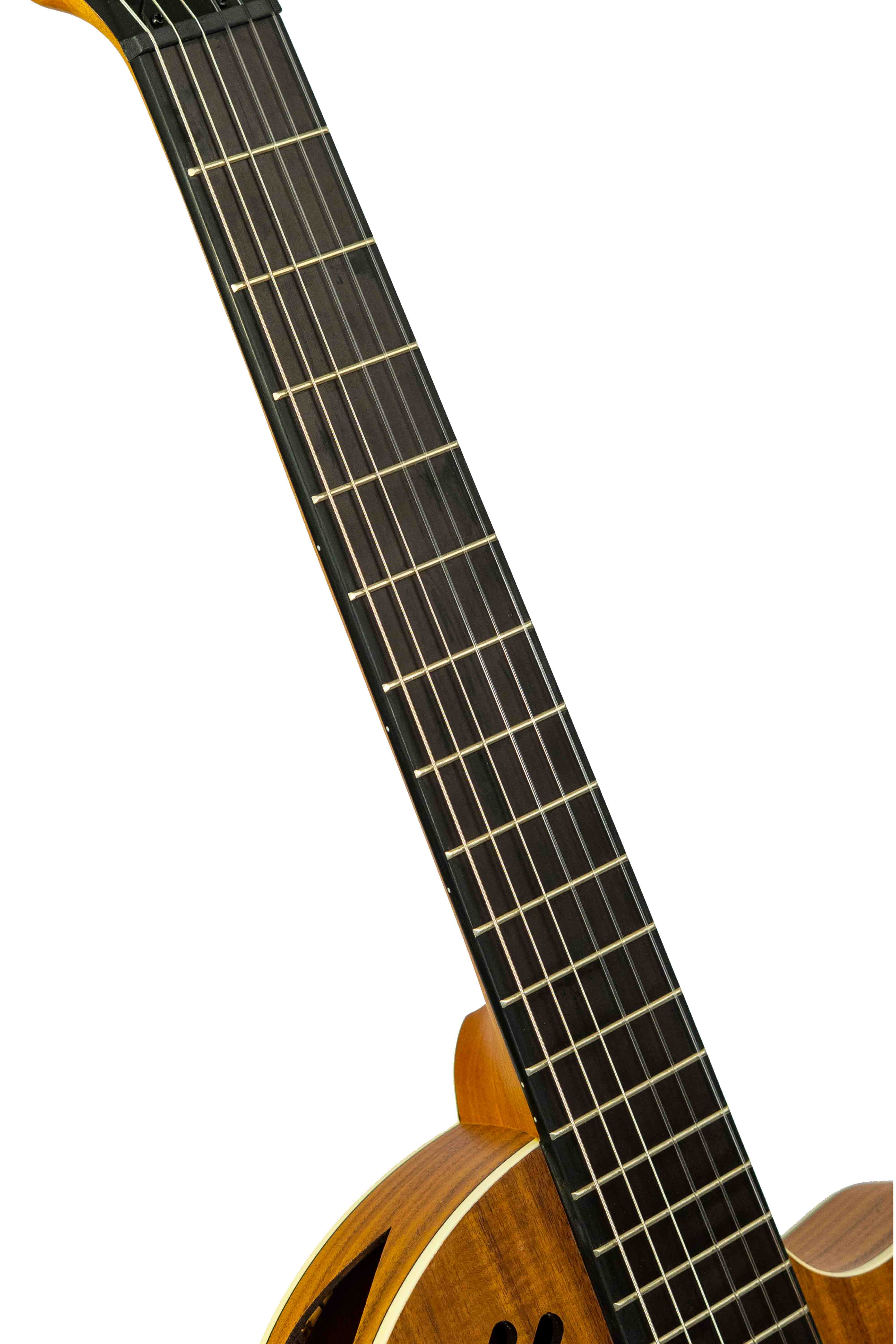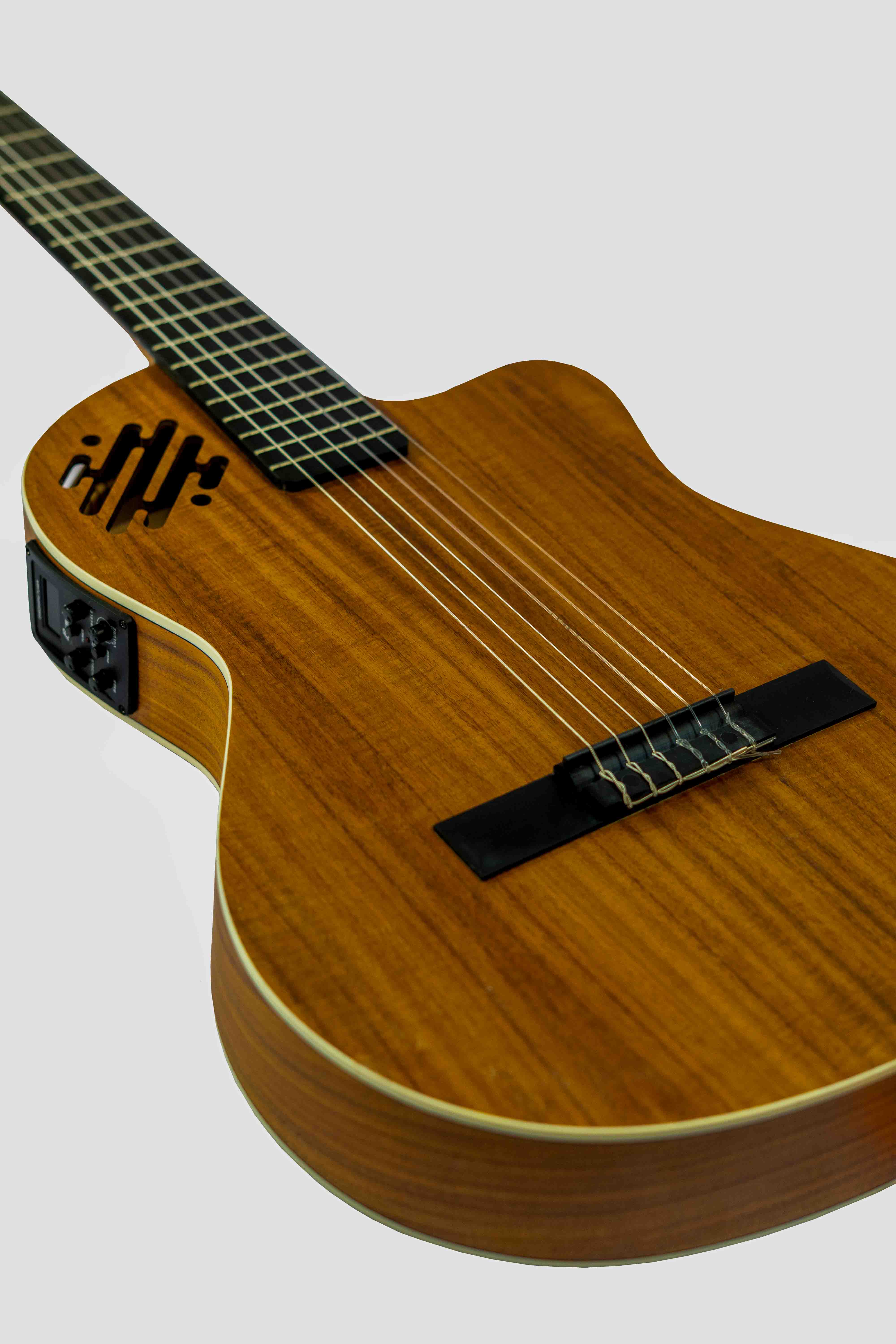 La Guitarra Electroacústica Koa Slim redefine lo clásico con un diseño moderno y minimalista. Su característica más distintiva es la ausencia de boca, lo que le otorga una estética única sin comprometer la calidad sonora.